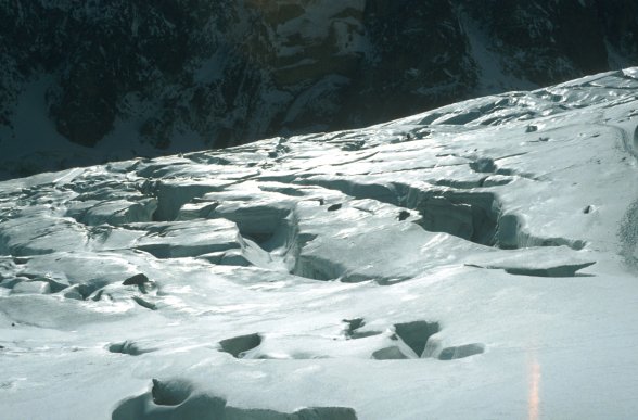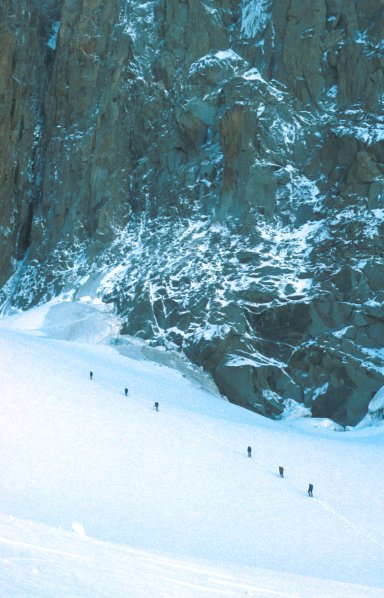 On the normal route of Aiguille D'Argentiere (3900m)The climbing on the glacier must be completed before the noon, because ice-bridge can not be used in the afternoon by the heat by sunshine