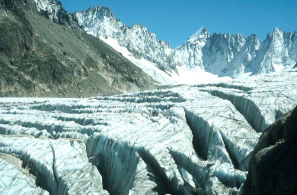 On the normal route of Aiguille D'Argentiere (3900m)The climbing on the glacier must be completed before the noon, because ice-bridge can not be used in the afternoon by the heat by sunshine